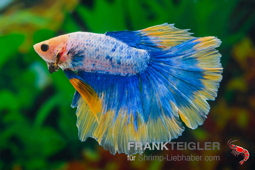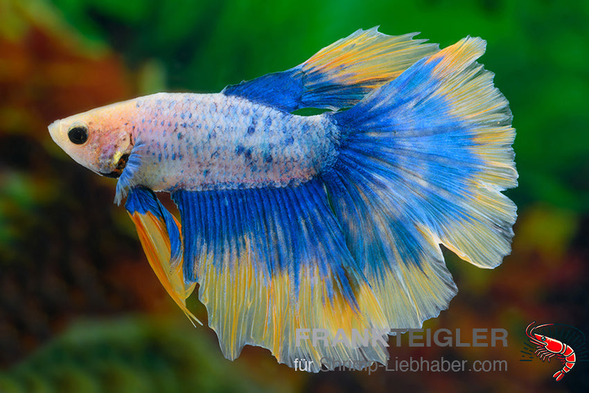 Der Betta splendens Halfmoon Bicolor ist eine besonders edle Zuchtform des Siamesischen Kampffisches. Charakteristisch sind seine weit aufgefächerten Halbmondflossen (Halfmoon-Form) sowie die kontrastreiche Zweifarbigkeit des Körpers und der Flossen. Mit seinem ruhigen, majestätischen Schwimmstil und den intensiven Farben ist er ein absoluter Blickfang und eignet sich ideal als Solitärfisch für stilvoll eingerichtete Aquarien.