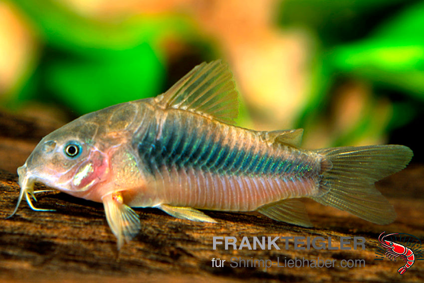 Der Dreieckspanzerwels (Corydoras eques) ist eine besonders markant gezeichnete Panzerwels-Art. Sein namensgebendes, dunkles dreieckiges Flankenmuster in Kombination mit dem silbrig schimmernden Körper macht ihn zu einem außergewöhnlichen Blickfang am Aquarienboden. Wie alle Corydoras ist er sehr friedlich, gesellig und ideal für gut strukturierte Gesellschaftsaquarien geeignet.