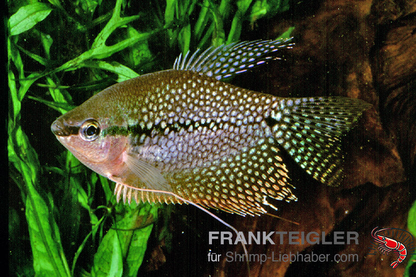 Der Mosaikfadenfisch (Trichogaster leeri), auch Perlfadenfisch genannt, zählt zu den schÜnsten und friedlichsten Labyrinthfischen. Sein perlmuttartig schimmerndes Mosaikmuster, der dunkle Längsstreifen sowie die elegant ausgezogenen Bauchfäden verleihen ihm eine besonders edle Erscheinung. Durch sein ruhiges Wesen eignet er sich hervorragend fßr gut bepflanzte Gesellschaftsaquarien.