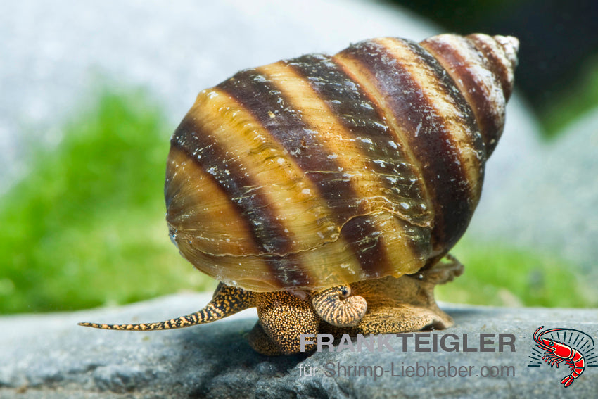 Die Piano-Schnecke (Taia naticoides) ist eine echte Rarität im Aquarium – nicht nur wegen ihres außergewöhnlichen Aussehens, sondern auch wegen ihres ruhigen, friedlichen Wesens. Ihr rundliches, glänzendes Gehäuse in schwarz-brauner Färbung mit heller Spirale erinnert an die Tasten eines Klaviers – daher ihr passender Name.